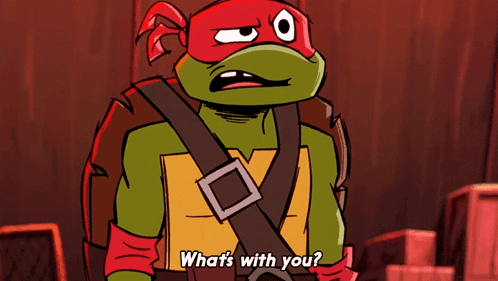 Raphael from Teenage Mutant Ninja Turtles asks 'What's with you?' with a confused expression.