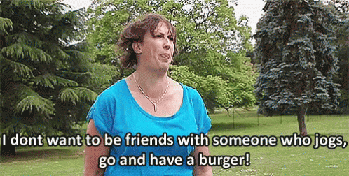 Miranda Hart hilariously declares her aversion to jogging, suggesting a burger instead, in a funny outdoor scene.