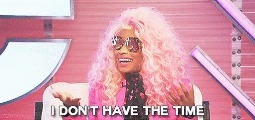 Nicki Minaj in pink hair and sunglasses, declaring 'I don't have the time' when asked about dating.