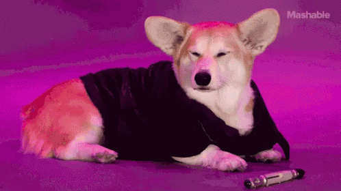 A corgi in a black robe has a sudden realization, looking surprised against a vibrant purple background.