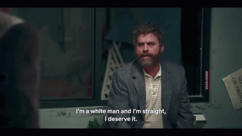 Zach Galifianakis humorously states, "I'm a white man and I'm straight, I deserve it."
