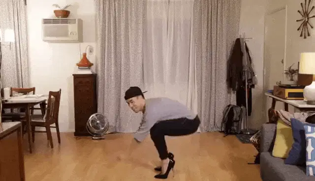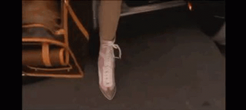 A character from White Chicks wears unique pink lace-up high heels next to a car, with a matching purse.