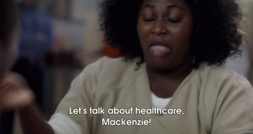 Taystee from Orange Is the New Black passionately discusses healthcare with Mackenzie, making expressive gestures.