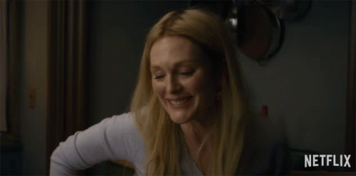 Julianne Moore says 'Who Knows?' with an expressive face in a Netflix ad.
