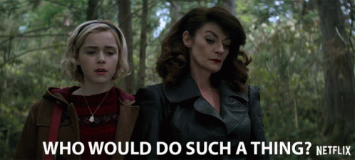 Kiernan Shipka as Sabrina Spellman and another woman walk through woods, asking 'WHO WOULD DO SUCH A THING?'.