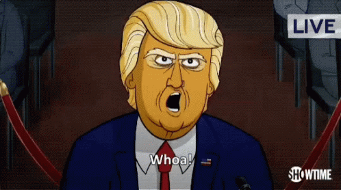 An animated Donald Trump caricature reacts with a surprised 'Whoa!' during a speech, from Our Cartoon President.