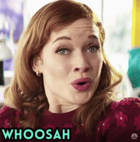 A woman takes a deep breath, saying 'Whoosah' to calm herself down in a moment of stress.
