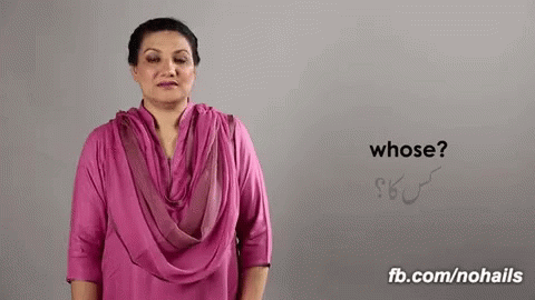 A woman demonstrates how to sign 'whose' in Pakistan Sign Language, with Urdu text 'کس کا?' also displayed.