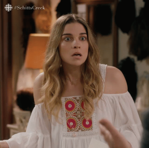 Alexis Rose from Schitt's Creek reacts with a surprised and frustrated expression, asking 'Why are you yelling at me?!'