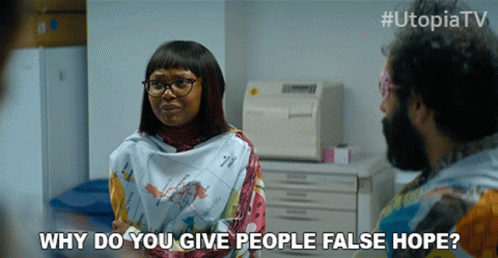 A woman from Utopia TV confronts a man, asking why he gives people false hope.