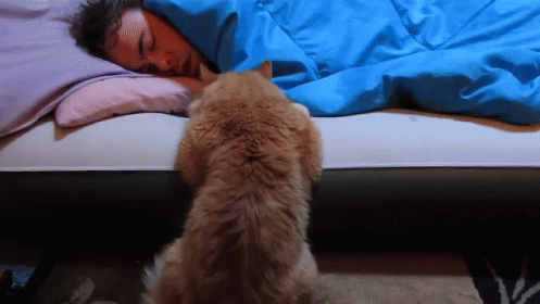 An adorable orange cat persistently tries to wake up a sleeping man by staring intently at him from the bedside.