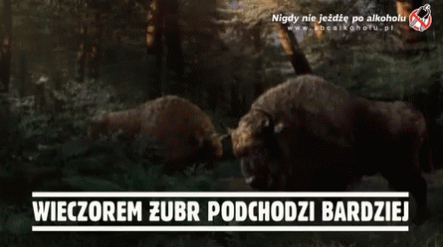 Two majestic bison in a dark forest at dusk, with a Polish anti-drinking and driving message.