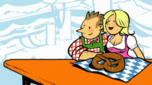 A cartoon couple enjoying Oktoberfest with beer steins and a pretzel on a checkered table.
