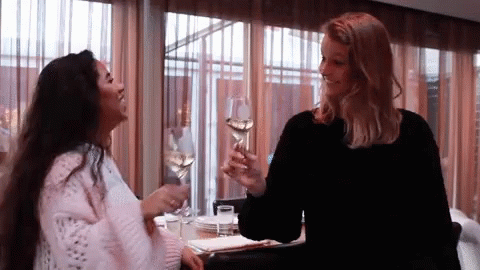 two women toasting with wine glasses in front of a large window