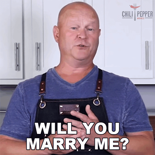 Michael Hultquist asks 'Will you marry me?' in an earnest proposal, wearing an apron.