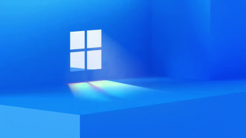 Animated Windows 11 logo with light rays in a minimalist blue room.