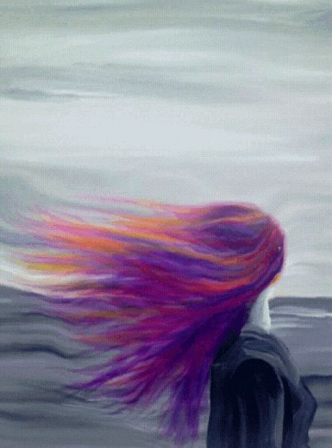 A vibrant painting of a woman with long, colorful hair blowing in the wind by the sea.