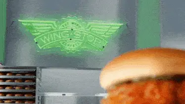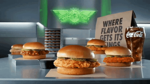 A display of various Wingstop chicken sandwiches and a Coca-Cola drink, featuring the Wingstop logo.