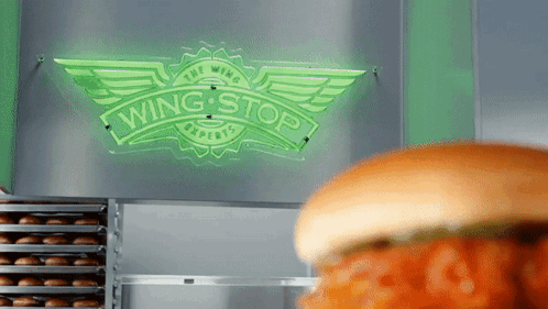 A close-up of Wingstop's chicken sandwich with pickles, featuring the iconic neon Wingstop sign.