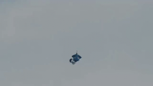 A wingsuit flyer descends through the sky, deploying a parachute branded with 'Red Bull' for a controlled landing.