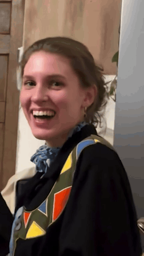 a woman wearing a black jacket and a colorful vest smiles for the camera