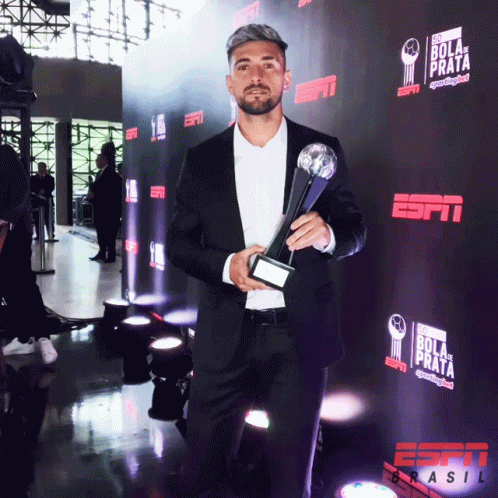 Arrascaeta proudly displays his Bola de Prata trophy at the ESPN Brasil awards ceremony.