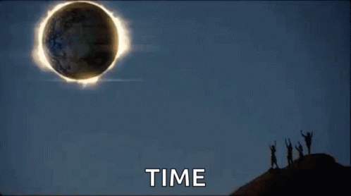 A striking eclipse with a bright corona, featuring the word 'TIME' overlaid, possibly related to Greta Van Fleet.