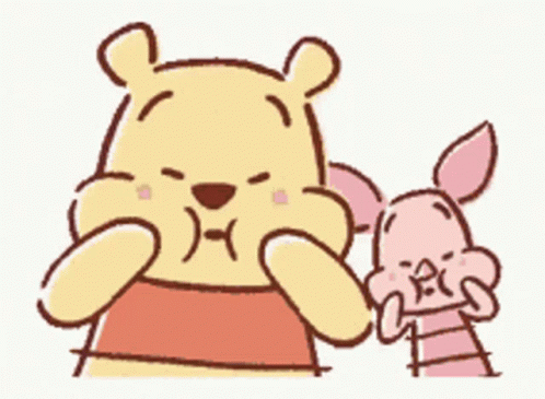 Winnie the Pooh and Piglet adorably cover their cheeks, showing a shy and loving moment.