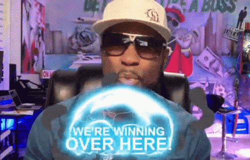 Caujuan Mayo, also known as Money Mayo, enthusiastically declares 'We're Winning Over Here!' while wearing sunglasses and a hat.
