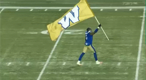 A Winnipeg Blue Bombers football player proudly waves the team's yellow 'W' flag on the field during a celebration.