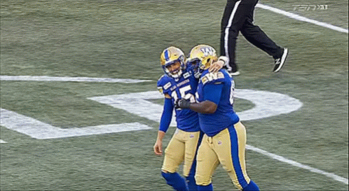 Winnipeg Blue Bombers players Matt Nichols and Stanley Bryant share a hug on the football field.