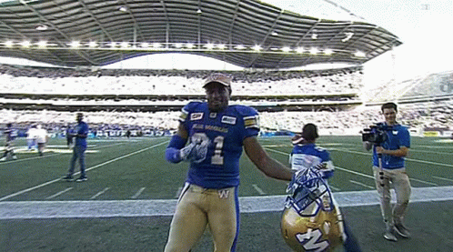 Moe Leggett of the Winnipeg Blue Bombers performs an air guitar on the football field.