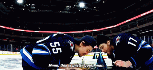 Winnipeg Jets player Adam Lowry, wearing jersey number 55, enjoys cake on the ice with a teammate.