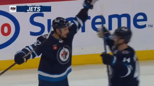 Winnipeg Jets player Nino Niederreiter celebrates a goal with teammates Mark Scheifele and Kyle Connor on the ice.