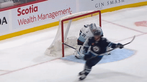 Winnipeg Jets player Pierre Luc Dubois celebrates a goal on the ice, wearing his team jersey.