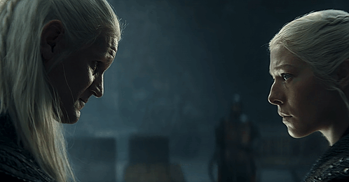 Daemon Targaryen and Rhaenyra Targaryen face each other in a tense moment, with the ominous subtitle 'Winter is coming'.