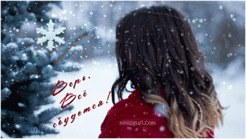 A woman stands in a beautiful snowy landscape with falling snowflakes and a decorated fir tree, conveying a message of hope: 'Believe. Everything will come true!'