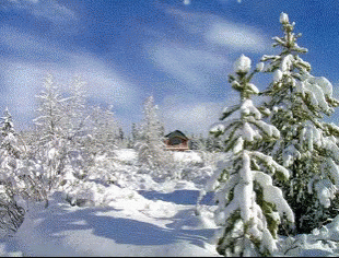 A serene winter dreamscape with a small cabin nestled among snow-covered trees as gentle snowflakes fall.
