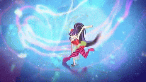 Musa from Winx Club performs an energetic coffee grinder breakdance move in a magical setting.