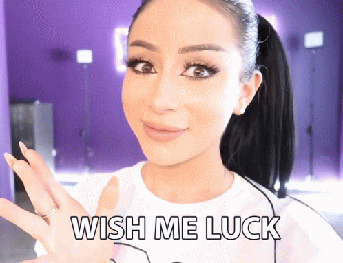 Amber Scholl asks for luck, showing a fingers crossed gesture while wearing a 'Wish Me Luck' shirt.