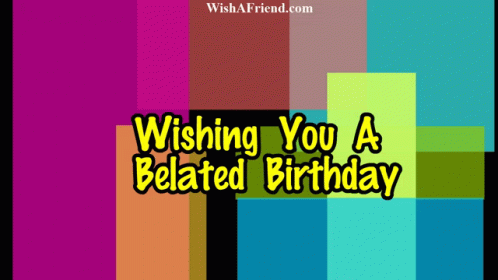 A colorful animated card from WishaFriend.com wishing someone a belated happy birthday.