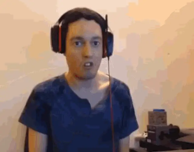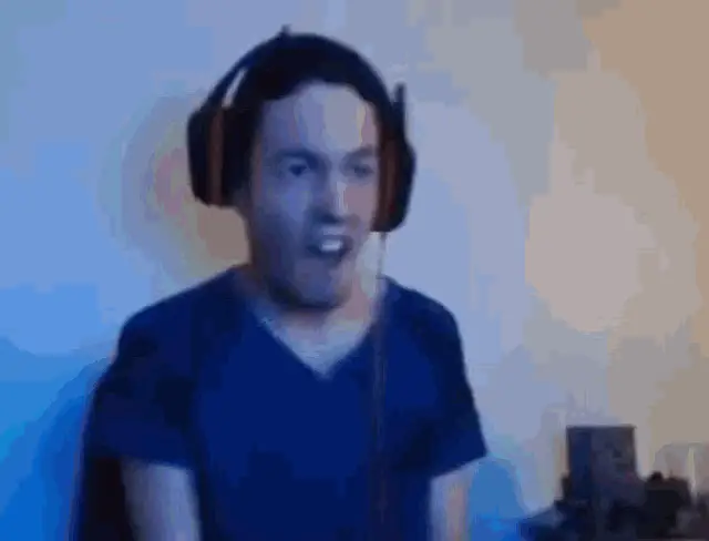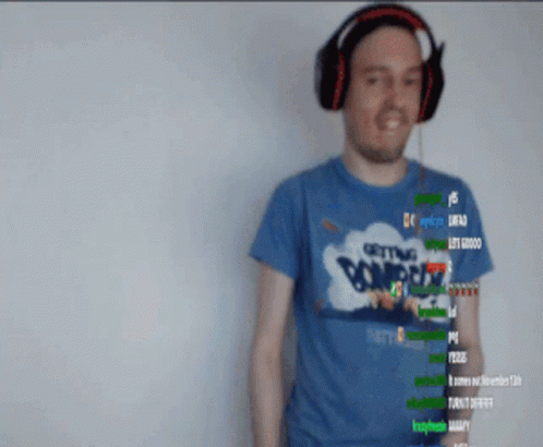 Artem Koval, also known as Wizardyensid, dances energetically during a Twitch stream, wearing headphones and a blue shirt.