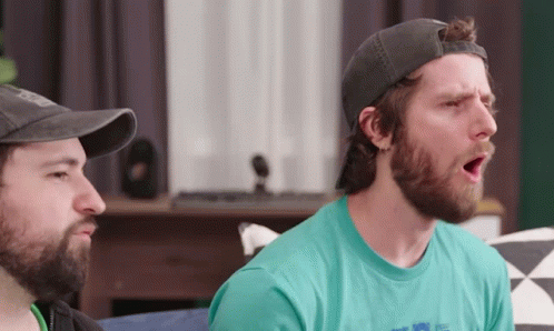 Linus and another man react with wide-open mouths as the word 'WOAH' appears on screen.