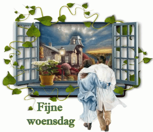 A couple looks out a window at a beautiful house, with "Happy Wednesday" greetings displayed below.