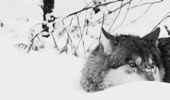A majestic wolf in a snowy landscape playfully eats and bites at the fresh snow.