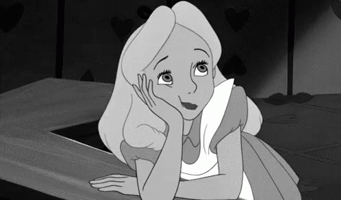 Alice from Alice in Wonderland, deep in thought with her hand on her face.