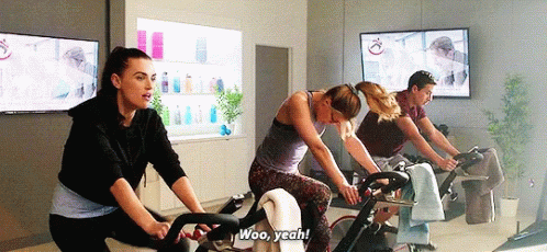 Kara Danvers and friends energetically ride stationary bikes in a spin class, with one exclaiming 'Woo, yeah!'