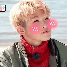 Woozi of Seventeen shows a cute blush, wearing a red turtleneck and green jacket with animated pink cheeks.