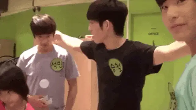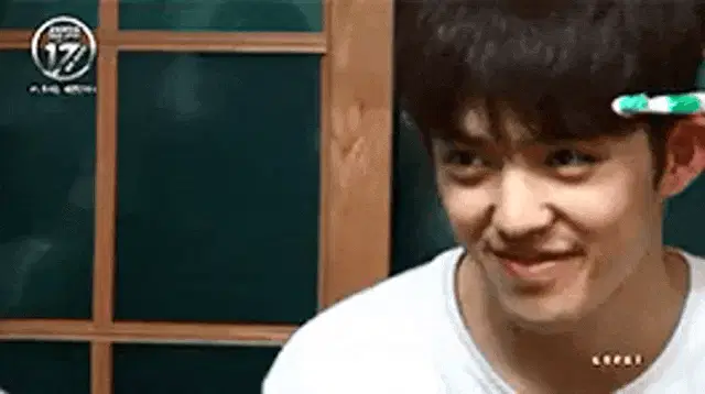 Woozi (Lee Jihoon) claps and smiles excitedly, wearing a baseball cap and white shirt.