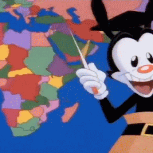 An Animaniacs character, likely Yakko Warner, points at a world map with a wide grin in this green-tinted scene.